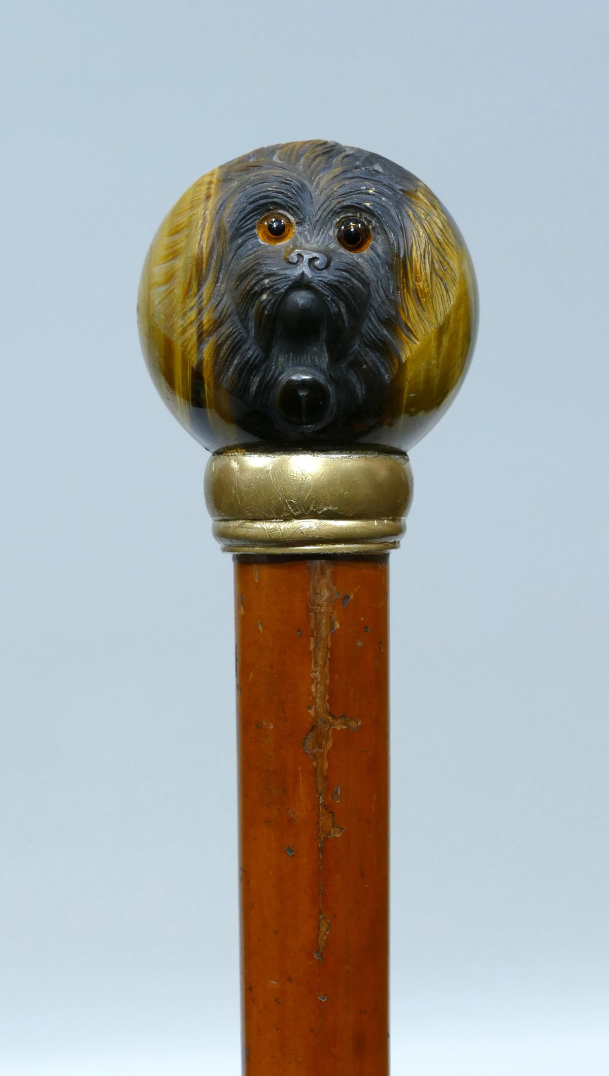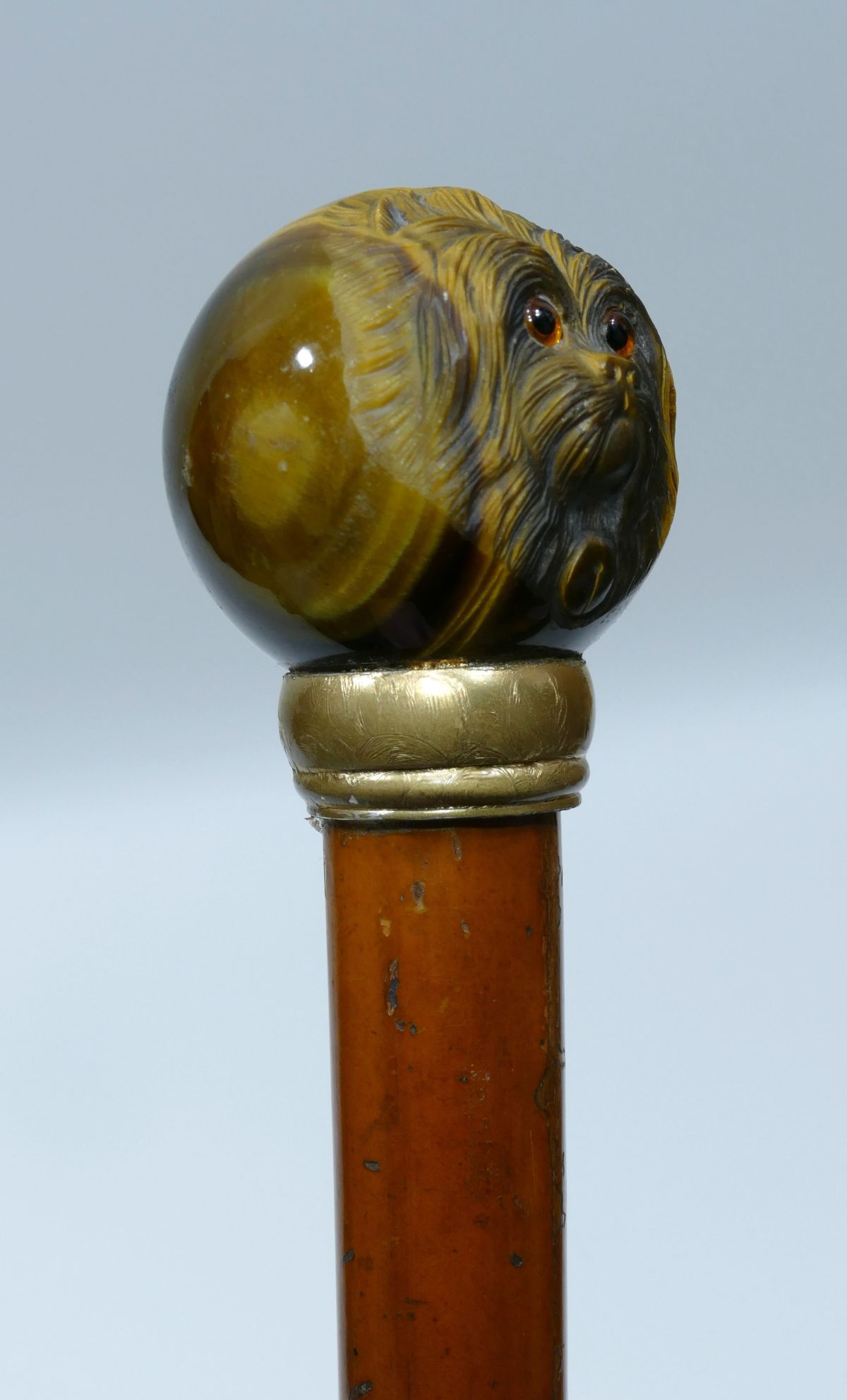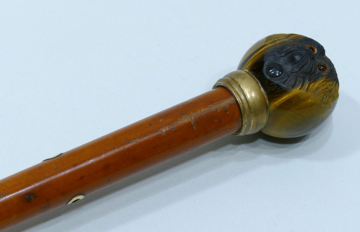 Antique cane with rare tiger's eye handle carved with a pekinese head with sulphur eyes.