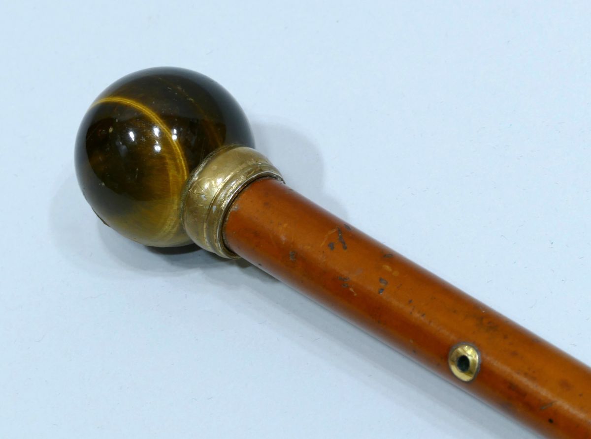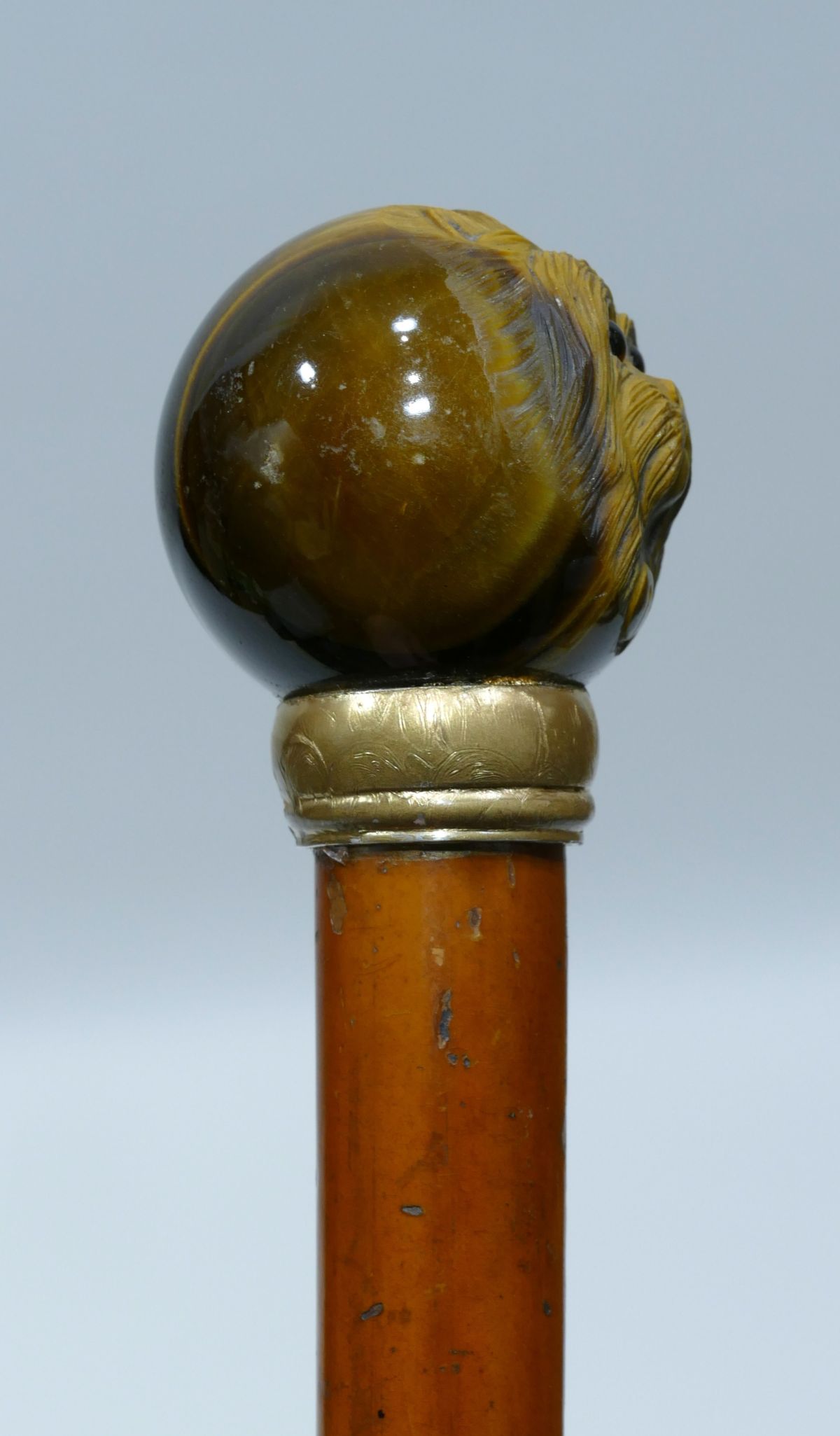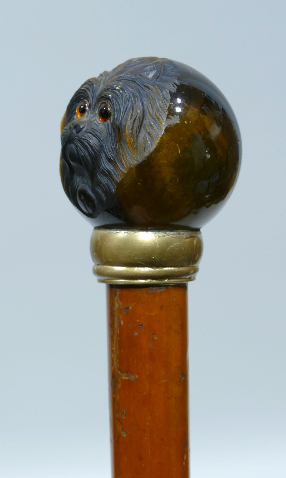 Antique cane with rare tiger's eye handle carved with a pekinese head with sulphur eyes.