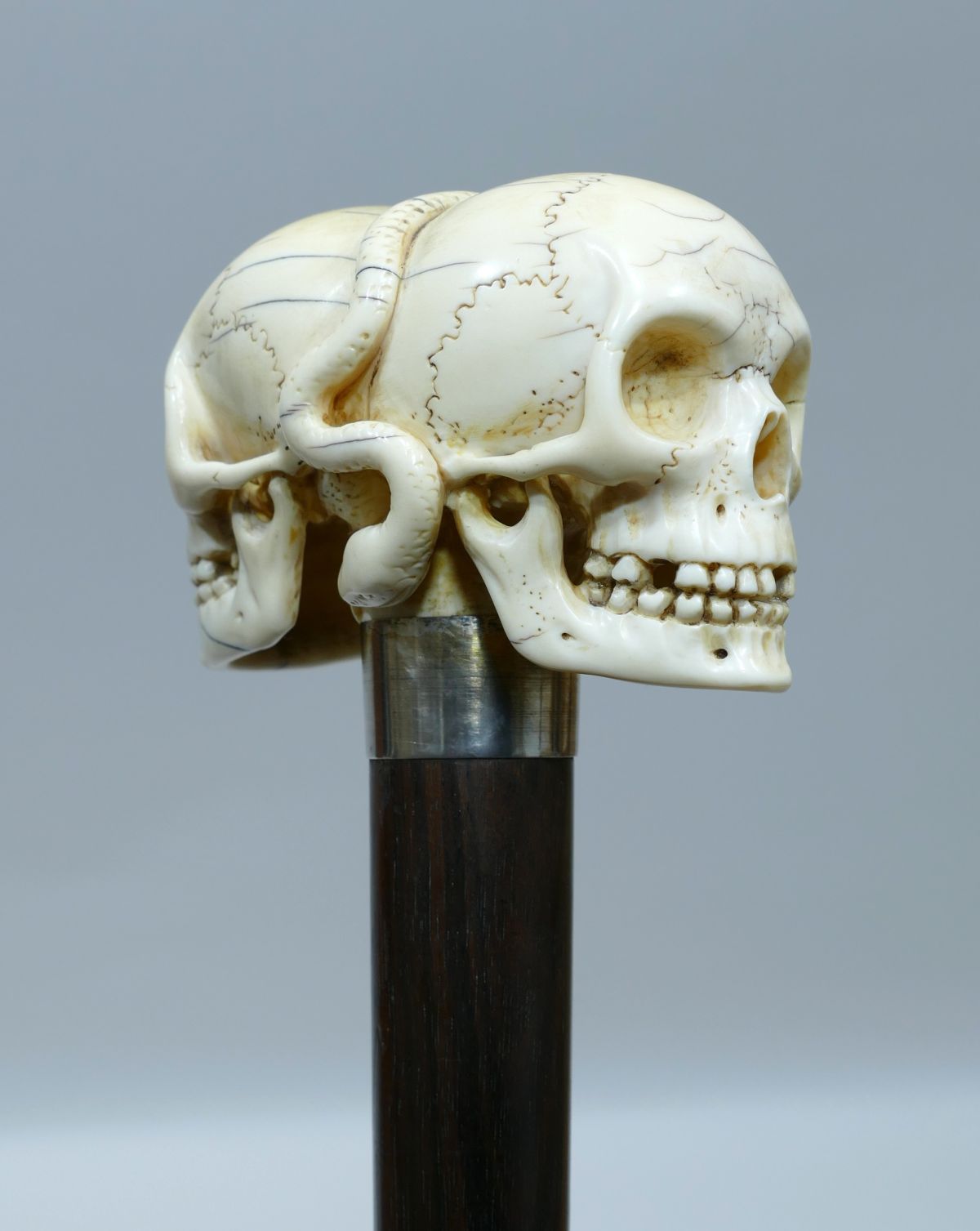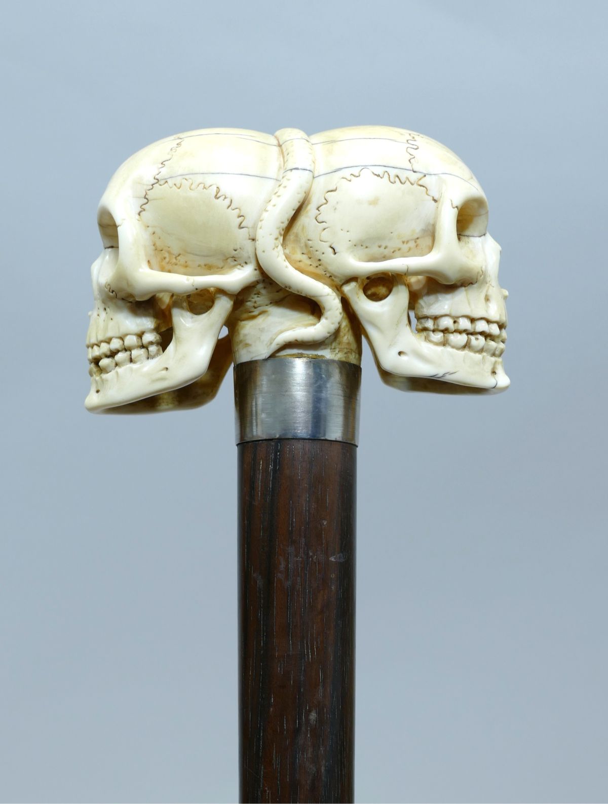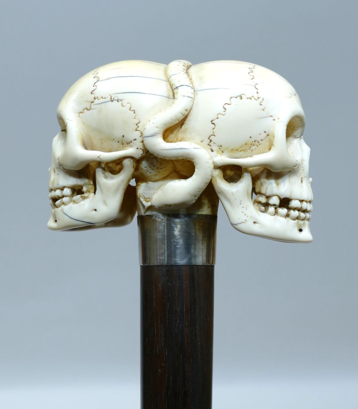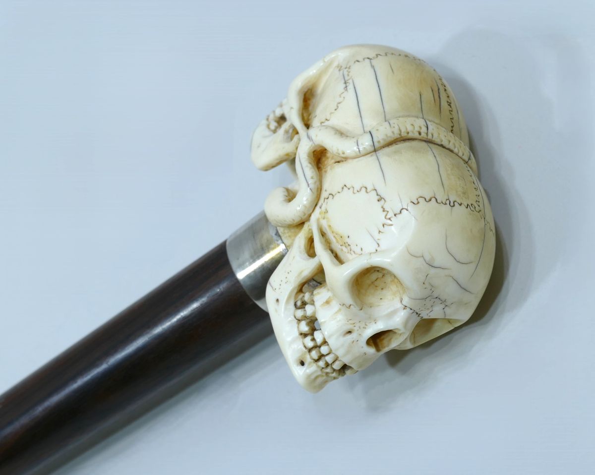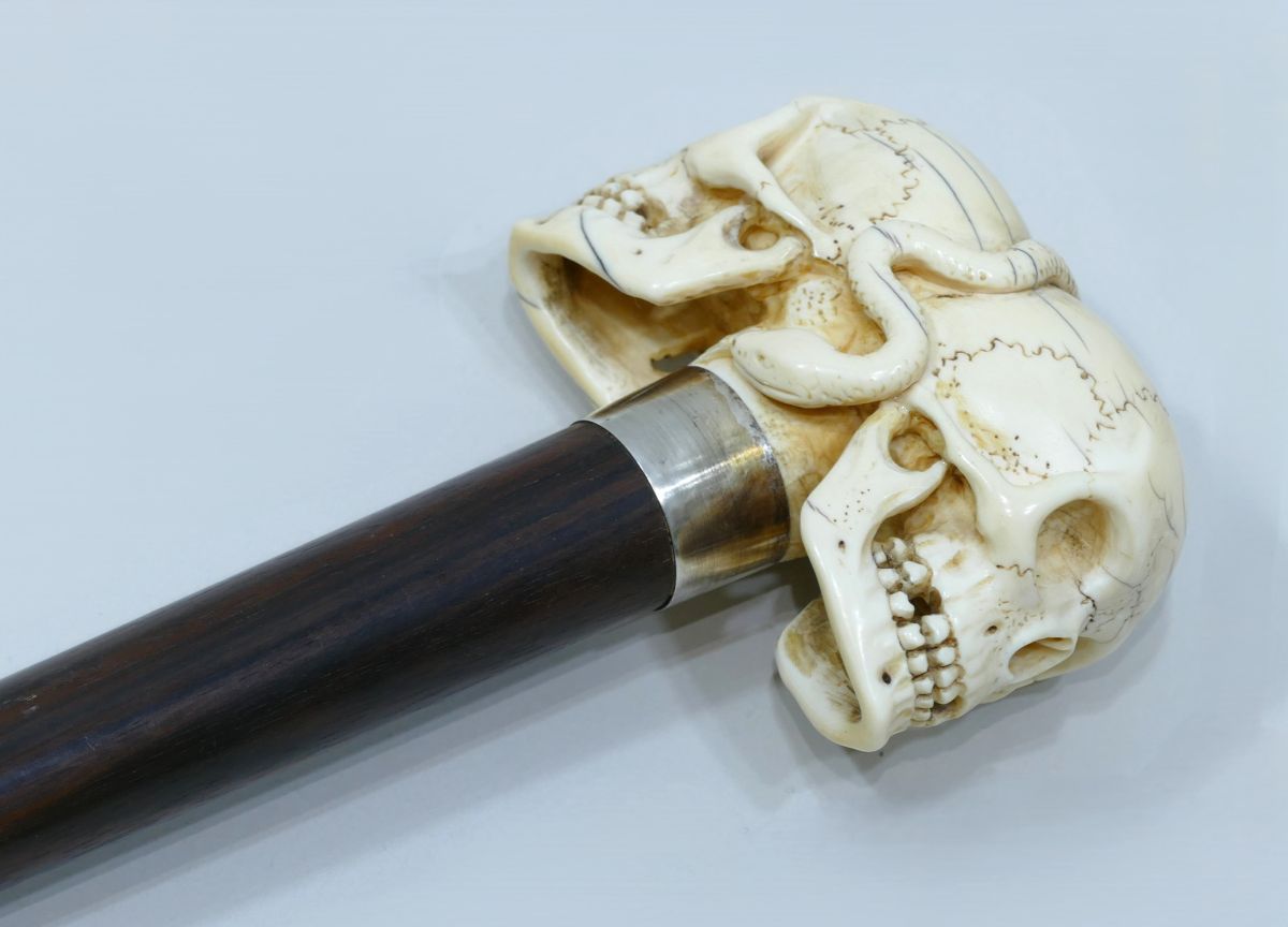 Great cane with beautiful ivory handle representing two opposing skulls with a snake in the center.